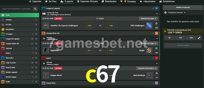 O c67 oferece uma grande seleção de opções de apostas em e-sports com probabilidades competitivas